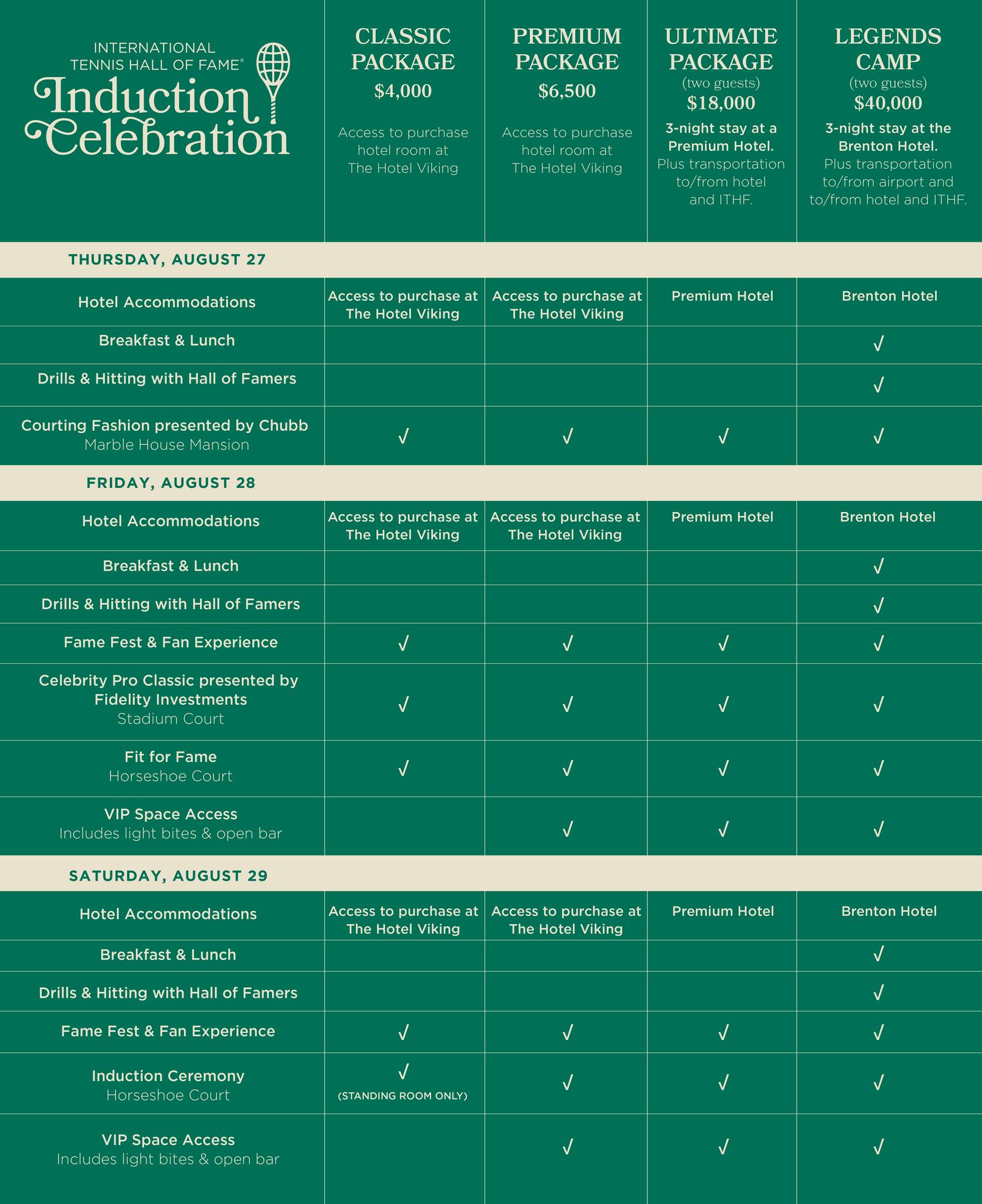 The Ultimate Package blends elevated hospitality with top-level event access, luxury lodging, and seamless transportation for an unforgettable 2026 induction experience.
