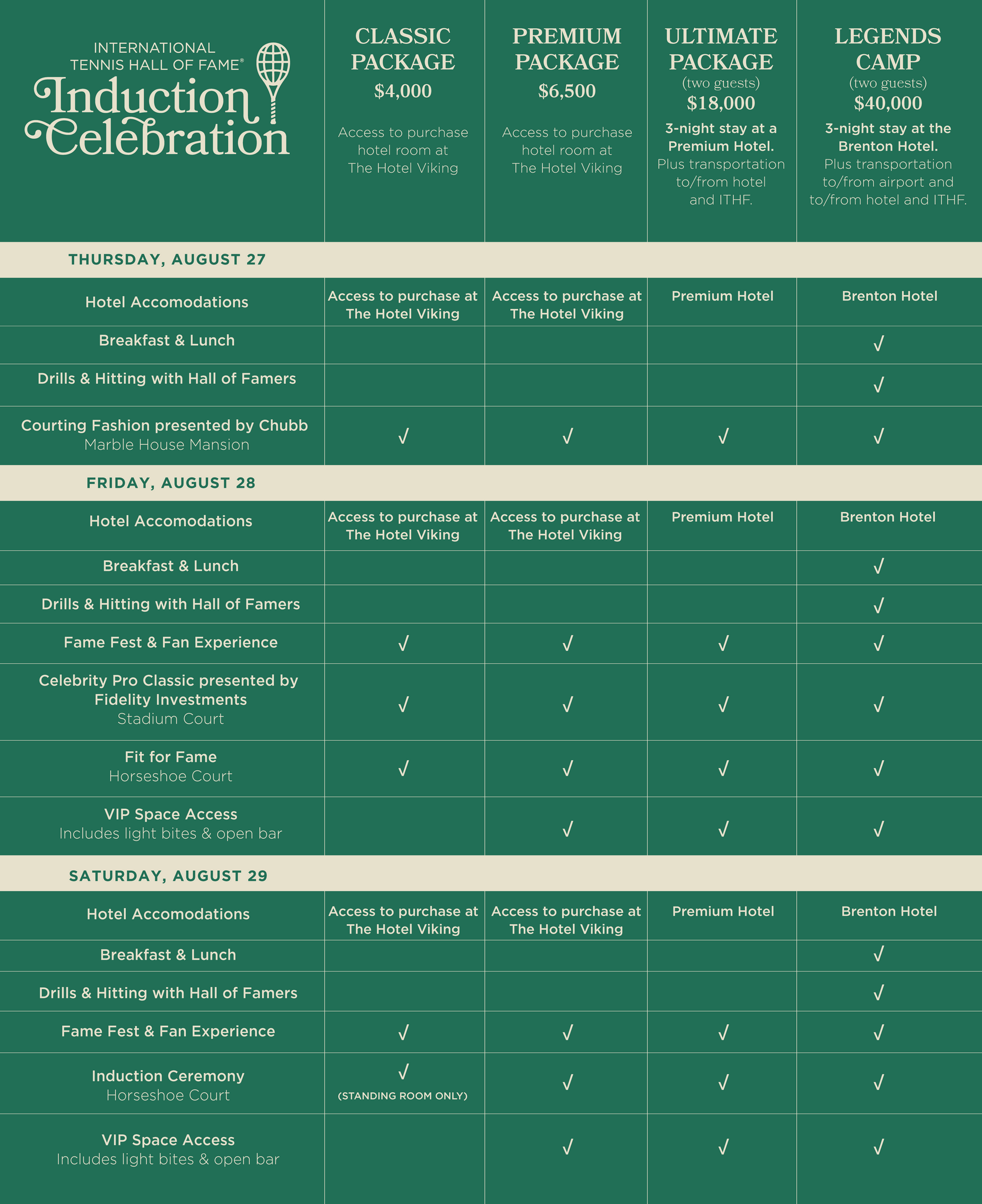 The Legends Camp Package is the pinnacle offering for tennis fans seeking unmatched access, luxury, and on-court excitement. Over three unforgettable days, enjoy elite tennis training, VIP hospitality, premier event access, and first-class accommodations—all curated to honor a once-in-a-generation induction weekend.