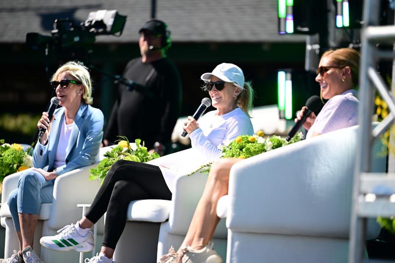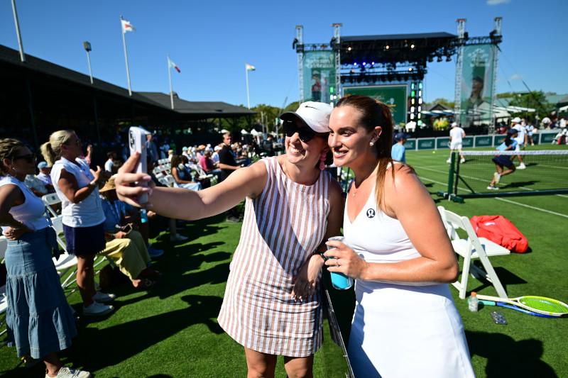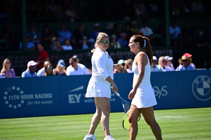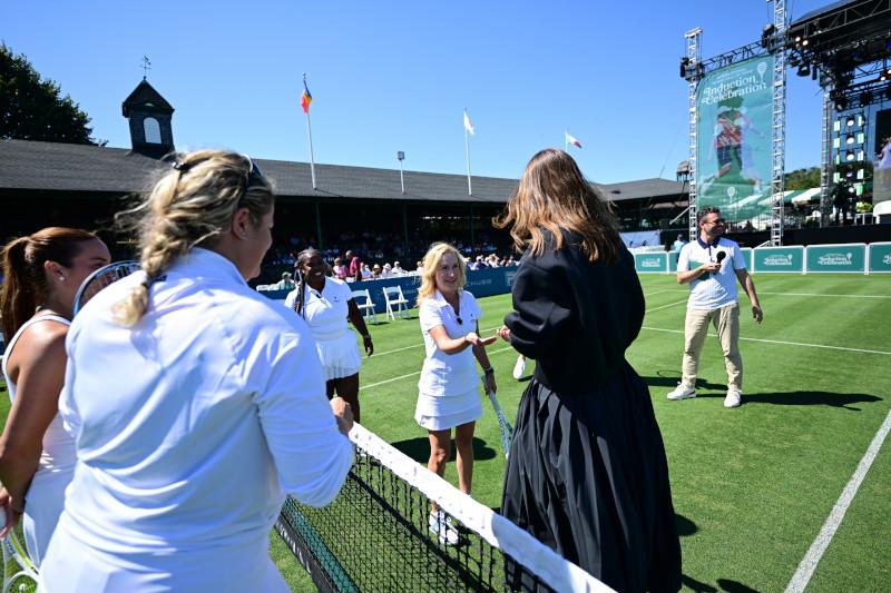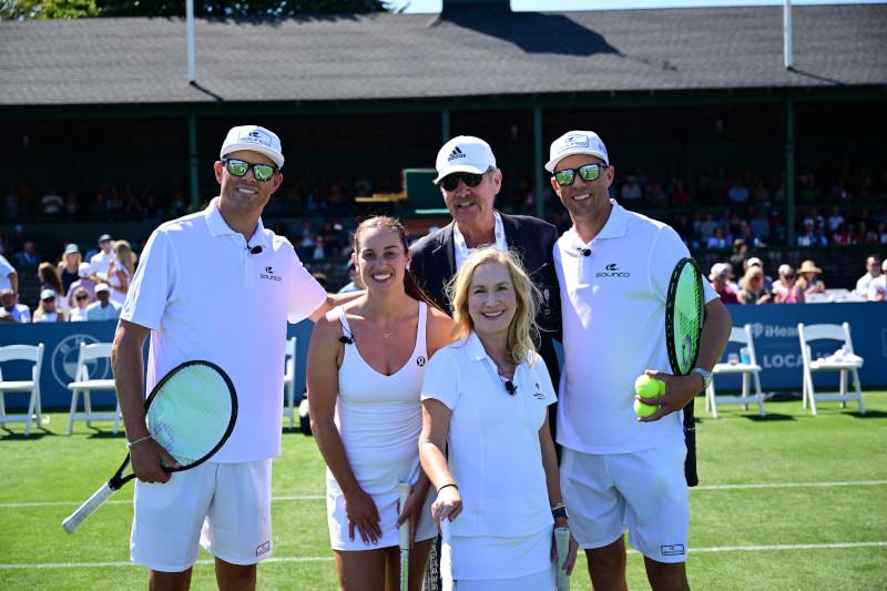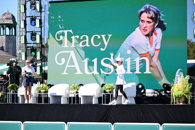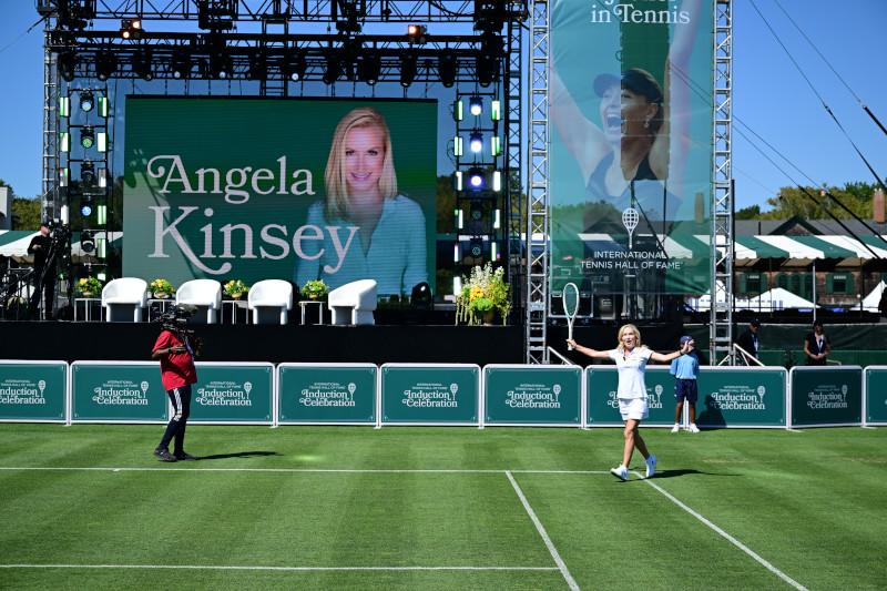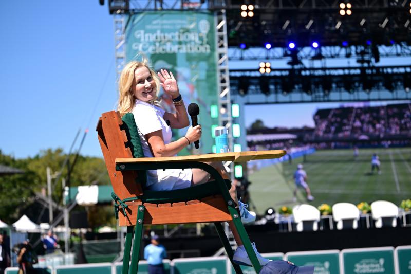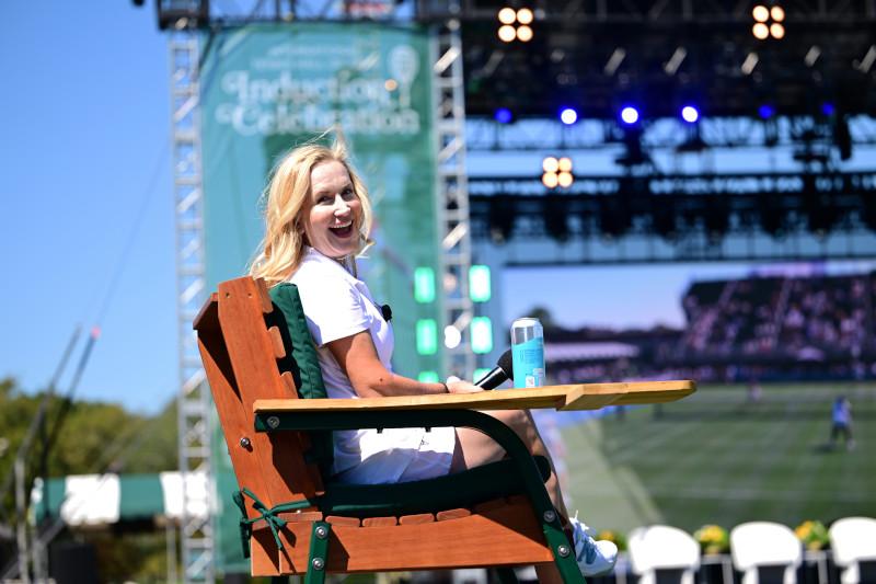 Kicking off and hosting the three-hour festivities, the dynamic broadcasting duo of Nick McCarvel and Blair Henley, subsequently joined in their broadcast booth located behind the court by such notables as Sharapova, ’92 inductee Tracy Austin, and ’95 inductee Chrissie Evert. Setting the tone in the opener were ’17 inductees Kim Clijsters and Andy Roddick, paired respectively with comedian Hannah Berner and Emmy-winning actress Uzo Aduba, in a match chaired by Angela Kinsey, most known for her longstanding role on “The Office.” Said Sharapova, “This is just one big celebration.” Her comment came shortly before Roddick grabbed a jumbo-sized racquet and volleyed one ball after another. Roddick’s need for such a frame came well after he’d been passed by Berner, who lettered at the University of Wisconsin.