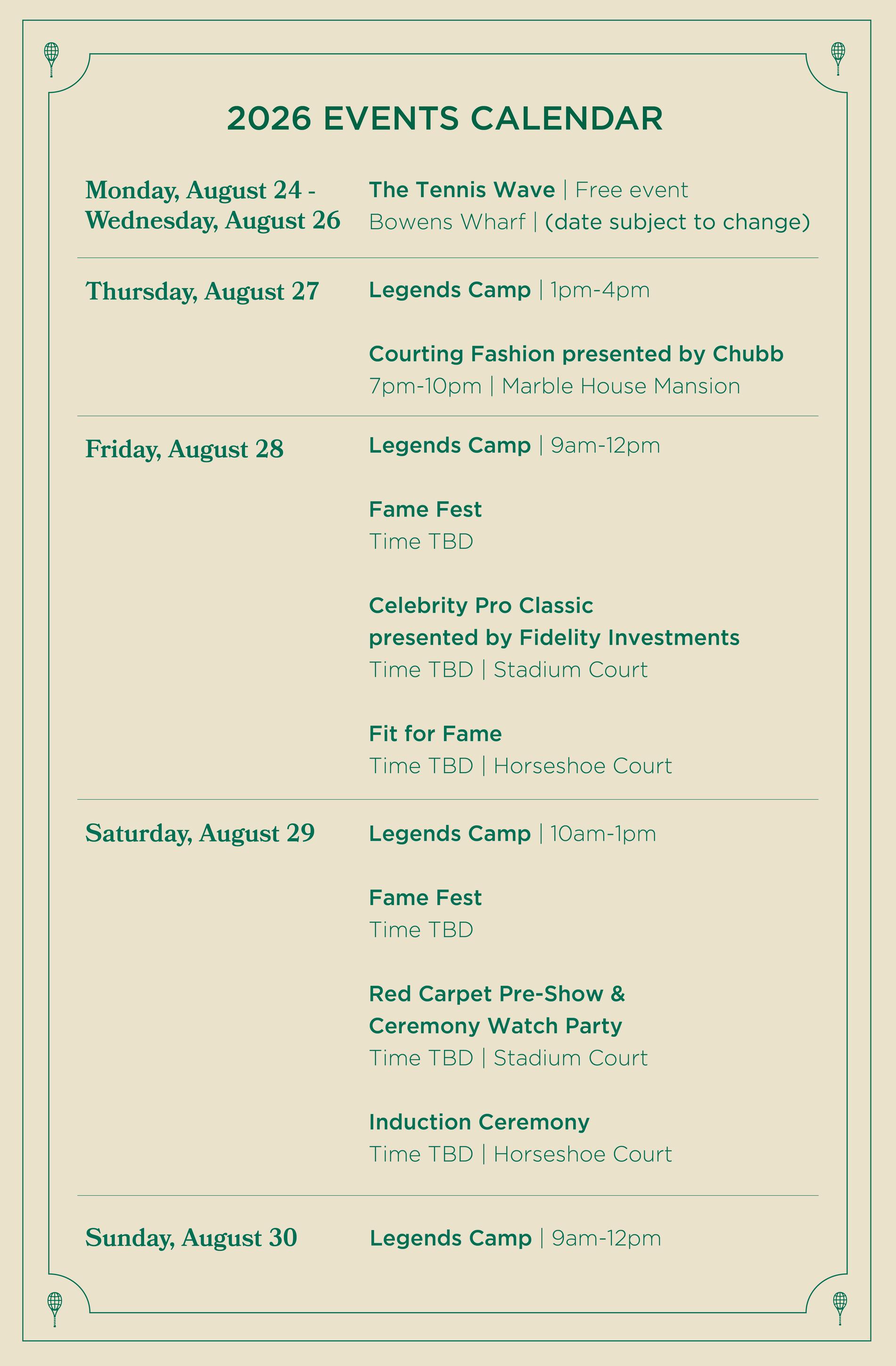 Prefer to build your own Induction Weekend experience? Single event tickets are available for select 2026 International Tennis Hall of Fame Induction Celebration events. Choose from the Red Carpet Pre-Show & Induction Watch Party, Courting Fashion presented by Chubb, or the Celebrity Pro Classic presented by Fidelity Investments. Tickets to the Celebrity Pro Classic presented by Fidelity Investments and the Red Carpet Pre-Show & Induction Watch Party include grounds pass, Fame Fest, and museum access, allowing you to enjoy on-site activities and fan experiences throughout the day. It’s the perfect way to be part of the celebration—your way.